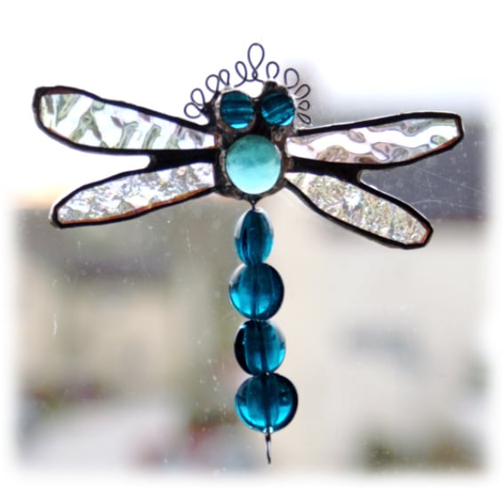 It looks really lovely hanging in the window where it catches the light. The suncatcher hangs from a strong nylon thread which is securely attached to the top of the dragonfly. It is 4inches wide and high.