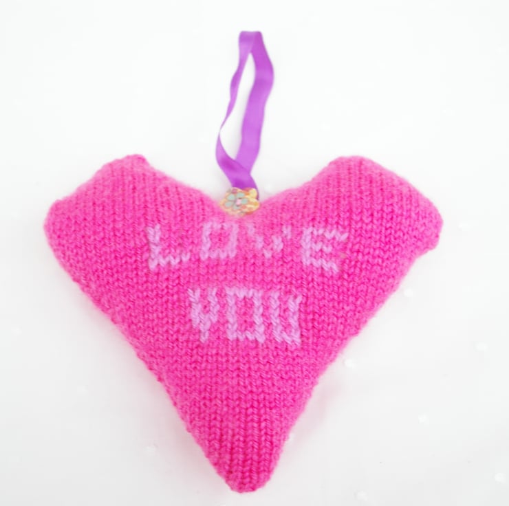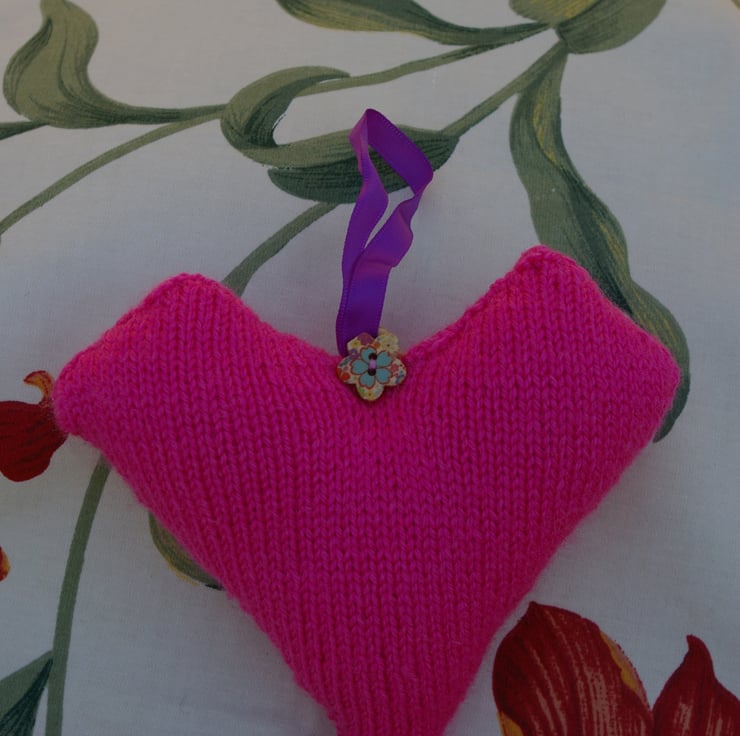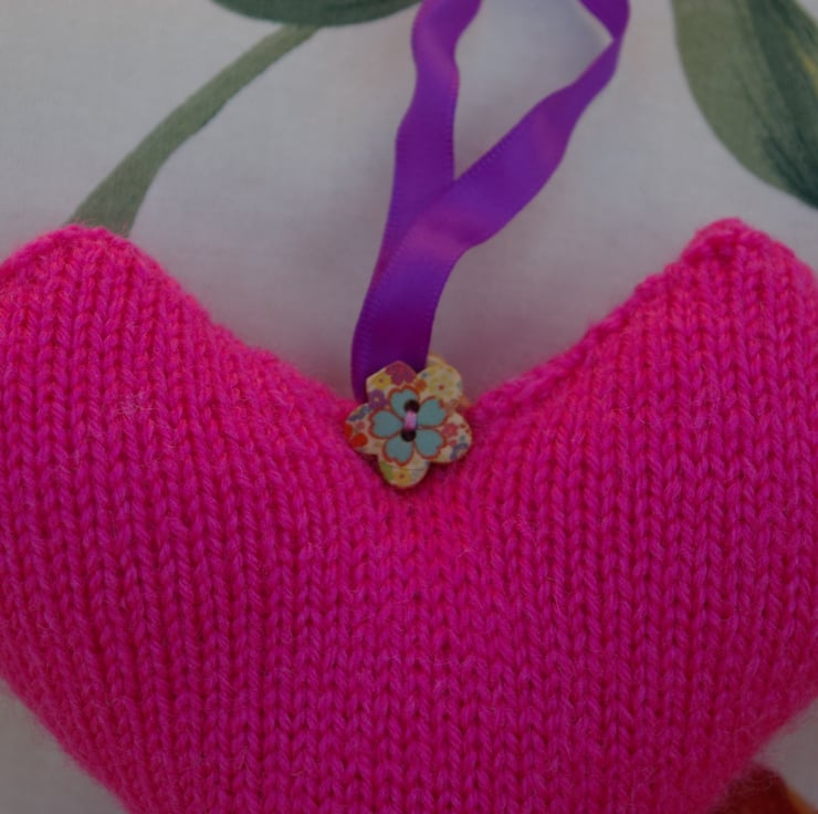 A hand knitted heart decoration in pink and pale lilac. Very special little gift to say love you that can be hang from a door handle. This heart sends a wonderful message whether it’s to a valentine sweet heart, a mother’s day gift or as a little gift to tell someone special that they are loved. The heart has been knitted in 100% Acrylic yarns. Then stuffed with polyester hollow fibres which have been treated with an anti allergy treatment. It is hung with a purple ribbon and decorated with two wooden flower buttons.
