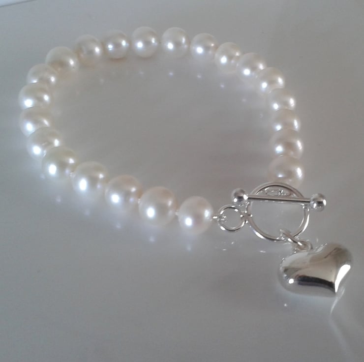 This is made using a 14 mm sterling silver puff heart charm and 7-8 mm cream freshwater pearls with a sterling silver toggle, it has been strung on pearl thread using the traditional knotting method in between each pearl which allows it to drape beautifully on the wrist and gives it extra strength.