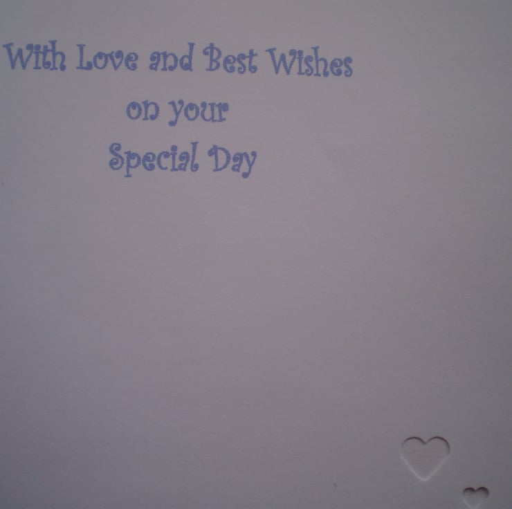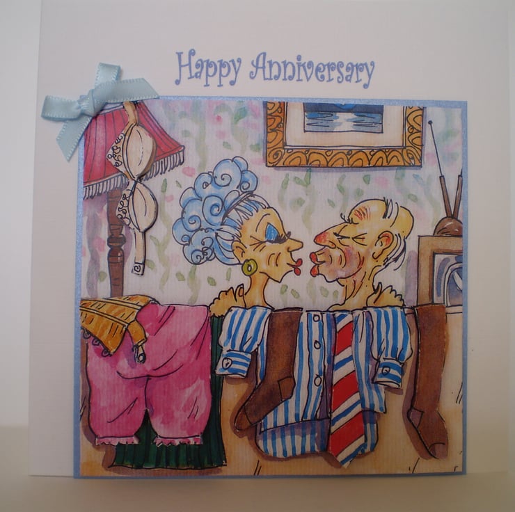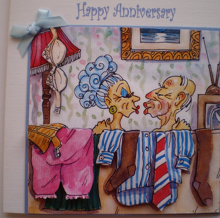 A square card measuring 144x144mm(5.5x5.5in) has a humorous couple sharing a romantic moment!.The greeting is printed directly onto the card .Insert is white with hearts punched in corner and some words. This card is 3D effect but there isn't a lot of cut out detail. The print is mounted on blue card and I have put a matching bow in corner