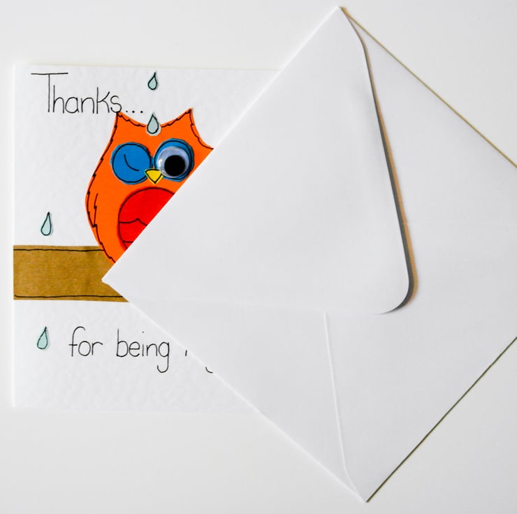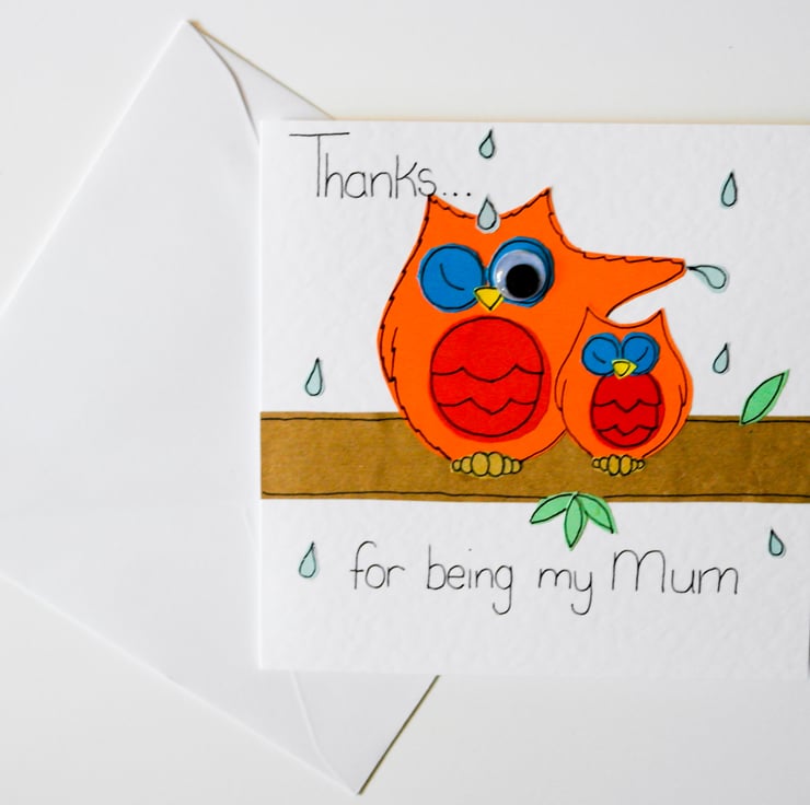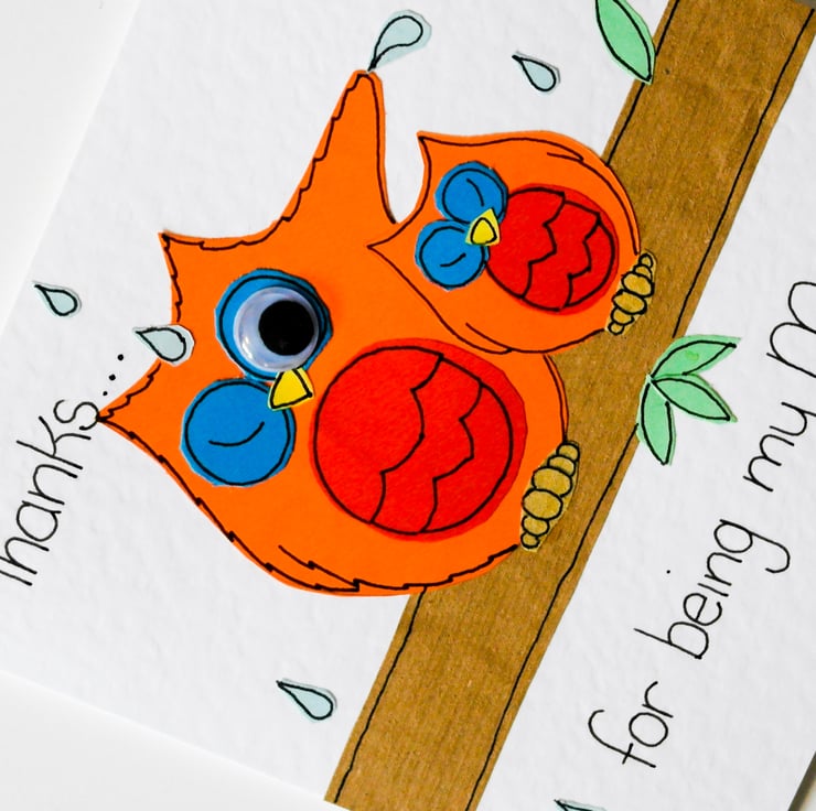 The Card Design is made by hand cutting each individual piece of the owls out of various coloured card and papers from my original design templates and finished by hand drawing the details and highlights in ink. They are then individually glued layer by layer to the card giving it a textured and slightly 'raised' appearance. I then add the googly eye to bring the card to life.