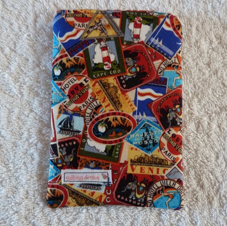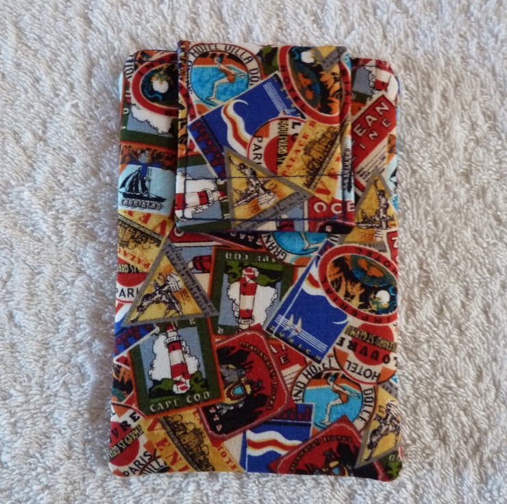 I have designed and created this useful mobile phone cover from a lovely travel luggage label print cotton. The case is lined with a plain blue cotton and has a fabric flap with velcro closure to secure your mobile device. The phone cover is padded with cotton wadding in order to protect your phone. It is top stitched for a professional finish.