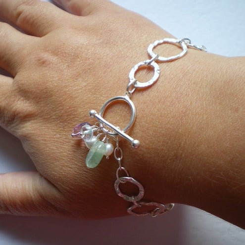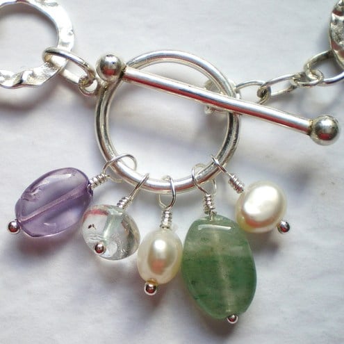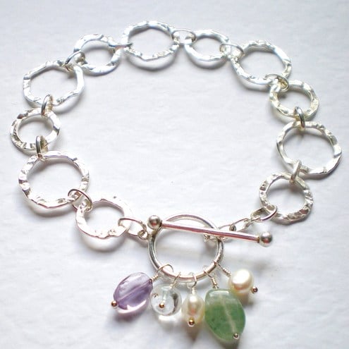 The bracelet is made from small (1cm) and large (1.5cm) patterned sterling silver hoops. It is fastened with a sterling silver toggle style clasp which has amethyst, aventurine, blue quartz and white freshwater pearl dangling from it.
