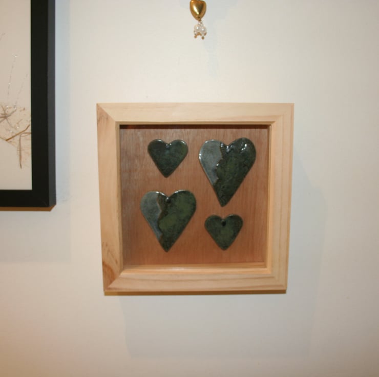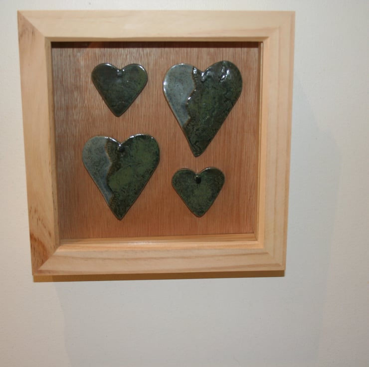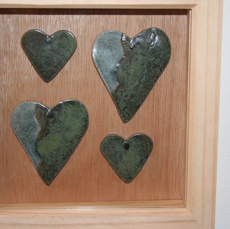Wooden picture frame containing four handmade ceramic lightly textured stoneware hearts, 2 are glazed in a speckled blue & green colour, 2 smaller hearts are glazed in a shiney green colour. Picture frame has been treated with bees wax & highlights texture of wood, ceramic hearts have been applied & tacked using small black pins to a wooden back drop which has been lightly washed with a darker bees wax colour.