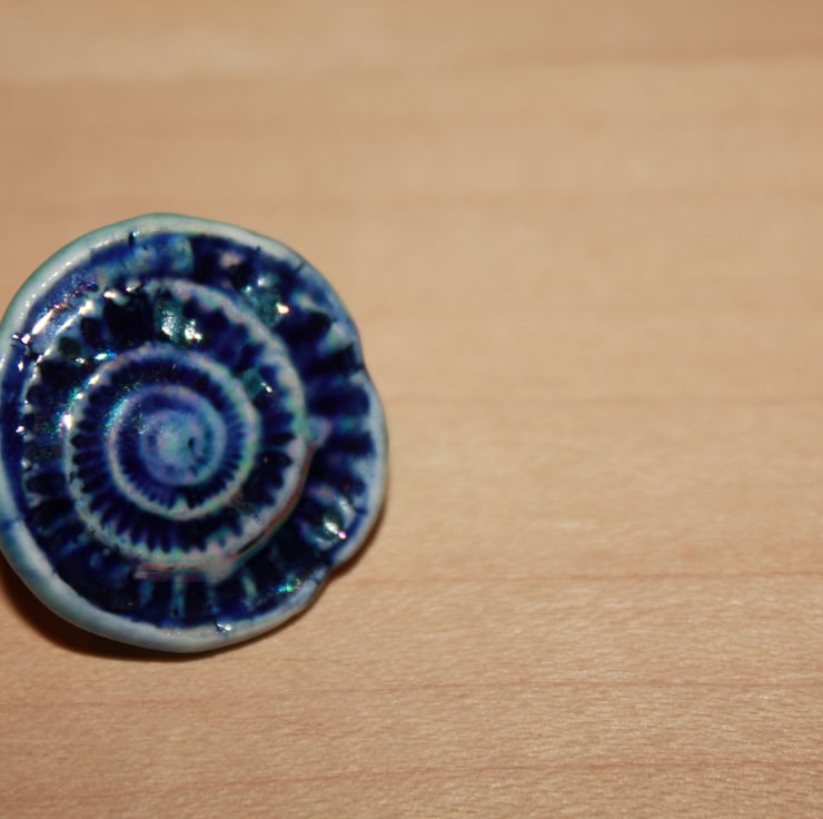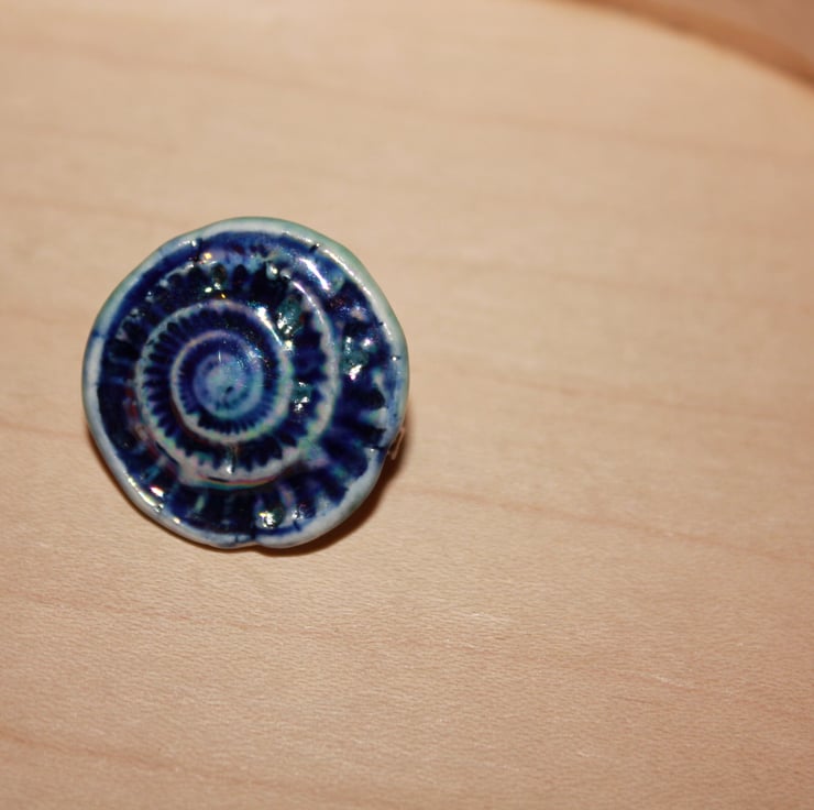 Handmade ceramic brooch using white porcelain stoneware, clay impressed ammonite finished in colbalt blue oxide, this was applied to the surface & then wiped away, clear glaze over the top, & colour using mother of pearl lustre.