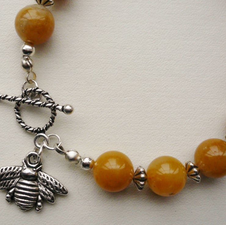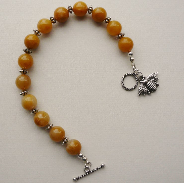 This bracelet is made up of 10mm golden jade round beads and silver plated bicone rondelle spacers. Together with fun silver plated bee charm and silver plated toggle clasp. Total length of bracelet incl clasp is 22cm.