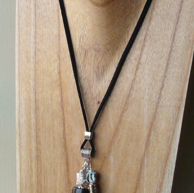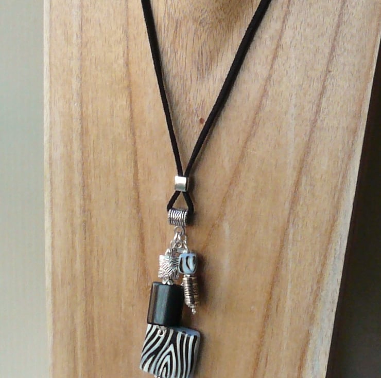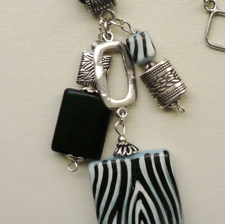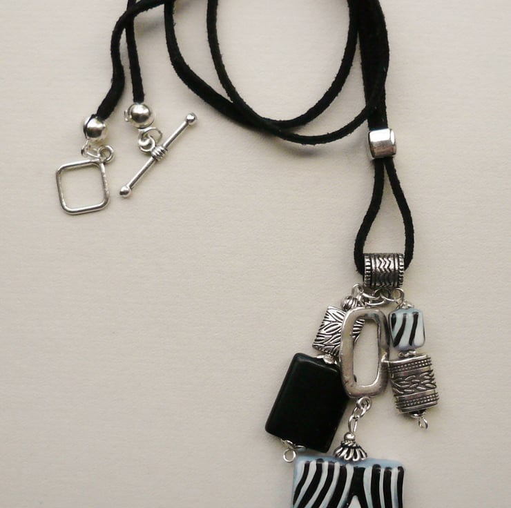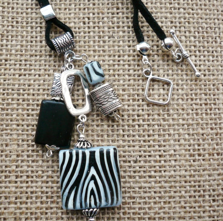 This necklace is made up of 25mm square and 8mm cube zebra print glass beads, 22mm long jet glass flat tube and silver plated connectors, beads, spacers and other findings. All hung on a 3mm thick, 60cm long black suede cord with silver plated toggle clasp.
