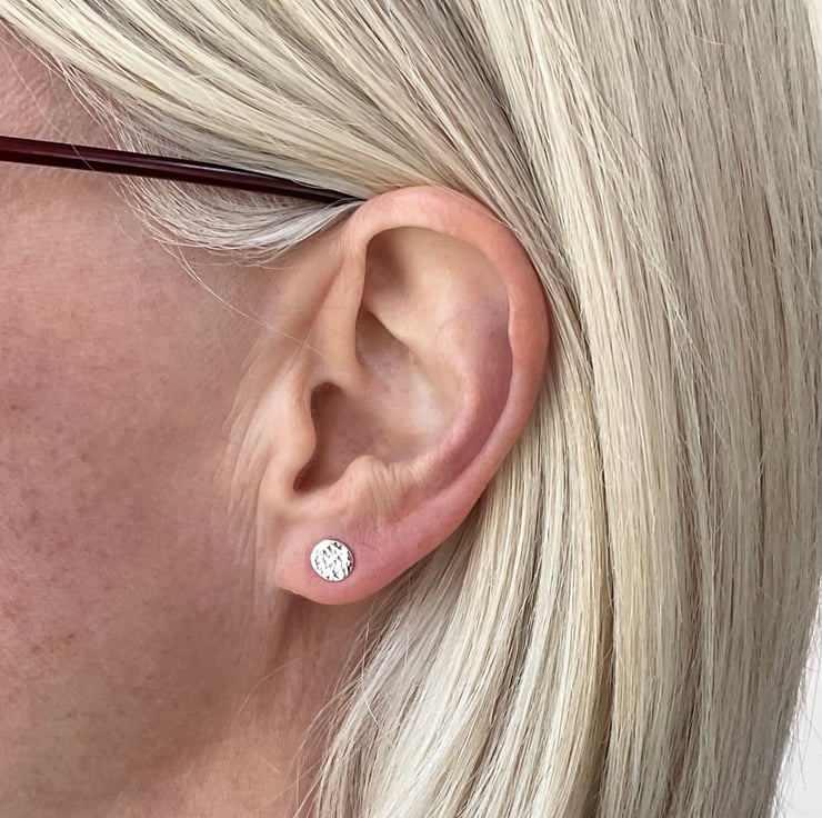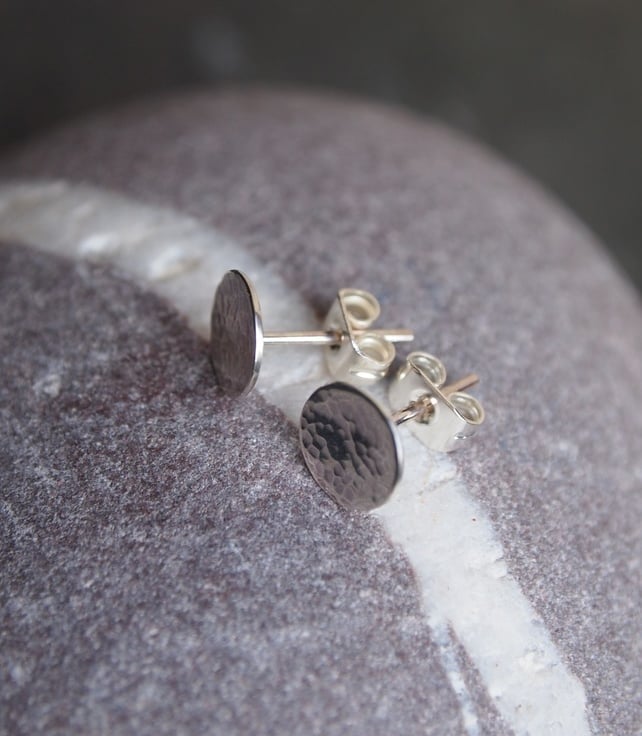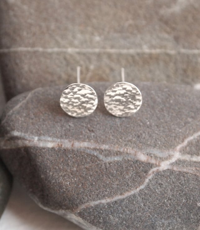 Small discs of silver have been very lightly hammered to add surface texture, then polished to a high shine to form these simple little everyday earrings. They come with sterling silver ear scrolls.