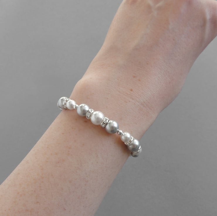The combination of the lustrous light grey and white pearls with the sparkling crystals makes this pearl and crystal bracelet ideal for a wedding or special occasion. Created using glass pearls, round silver beads and bands set with sparkling crystals, this single strand bracelet would be ideal for bridesmaids in a silver / grey themed wedding.