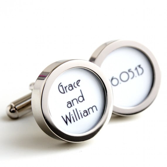 Custom Art Deco cufflinks for the groom with the names of the bride and groom on one cufflink and their wedding date. The lettering is a 1920s Art Deco font, black letters on a white background. Part of a range of cufflinks for all of your wedding party. Let me know your wedding date and names when you checkout.