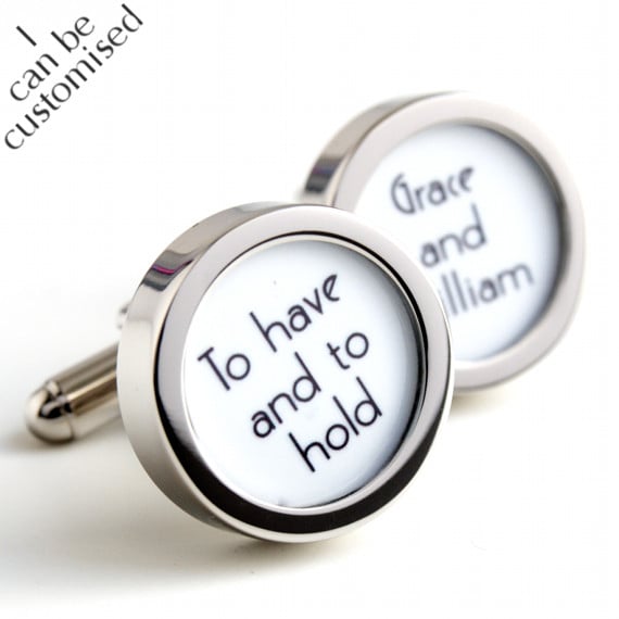 Custom made cufflinks for the Groom in a 1920s Art Deco style with black lettering on a white background. They have the words "To have and to hold" on one cufflink and the names of the bride and groom on the other. Please let me know what names you would like featured when you checkout.