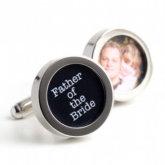 Father of the Bride wedding cufflinks with a photo of father and daughter in one cufflink, and 'Father of the Bride' in the other. Vintage typewriter lettering in black on a white background. The photo is of you and your daddy, as either adults together or perhaps with you as a child. A lovely and very personal gift for your father to wear on your special day. Part of a range of cufflinks for all of your wedding party.