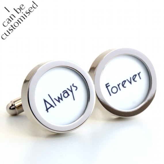 Cufflinks with the words Always and Forever in a beautifully simple 1920s Art Deco style of lettering, black letters on a white background. These cufflinks are also available with a black background or your choice of colour.