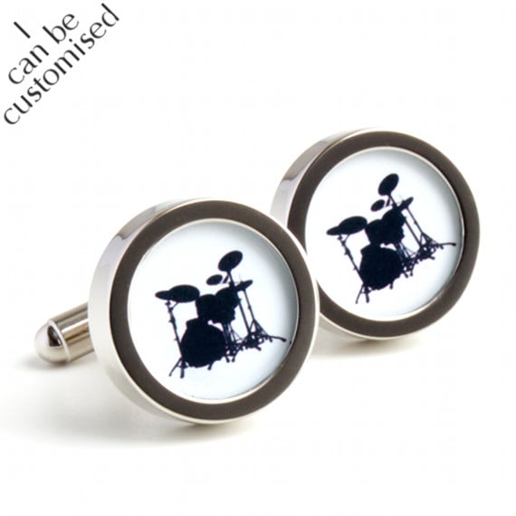 Drum kit cufflinks with a black drum set silhouetted on a white background. Choose either a black background or a white background. Alternatively I can make this in your choice of colours, just let me know at checkout if you would like me to custom make them for you.