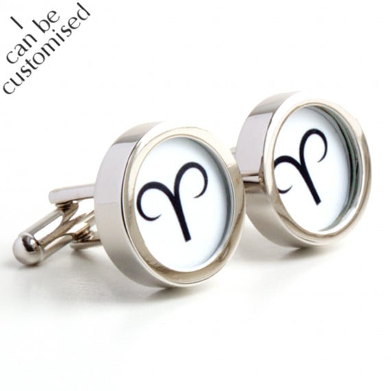 Cufflinks for Aries Men born in March and April in an elegant stylised design. A stylish birthday gift for the man in your life. Pictured above in black on a white background. Also available in white on a black background or your choice of colour.