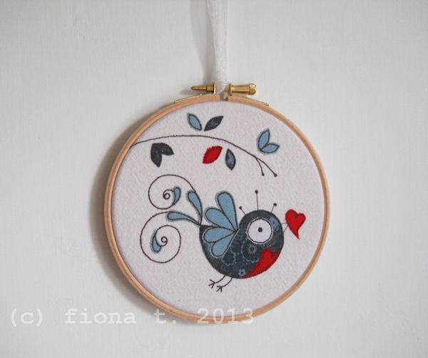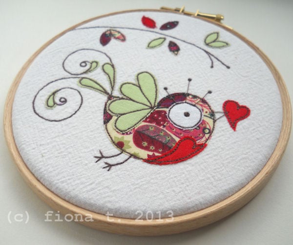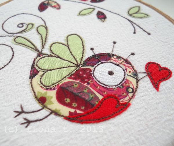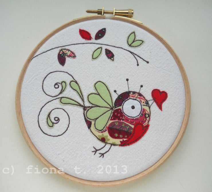 it features a little bird, carrying a red heart in its mouth. the bird is in a beautiful liberty print fabric, with a bright red heart on its chest. wing and tail feather detail is in apple green cotton, and the tiny leaves decorating the branch above its head are in coordinating cottons.
