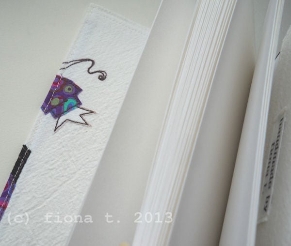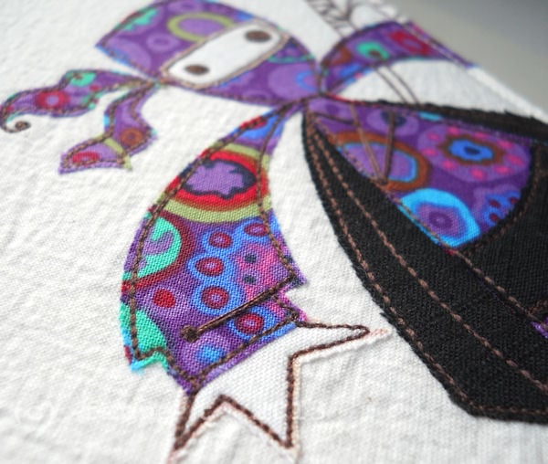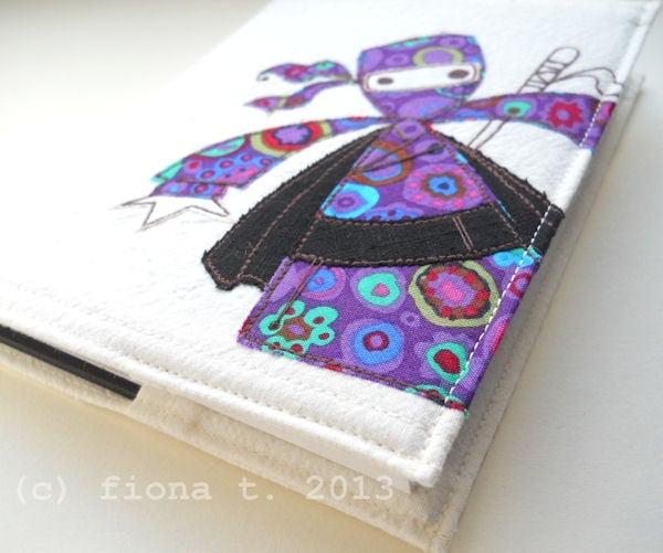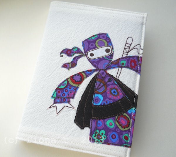 this notebook cover features a unique appliqued and embroidered ninja on the front cover. based on an original drawing by Little Black Heart, it is entirely handmade by me on a domestic sewing machine.