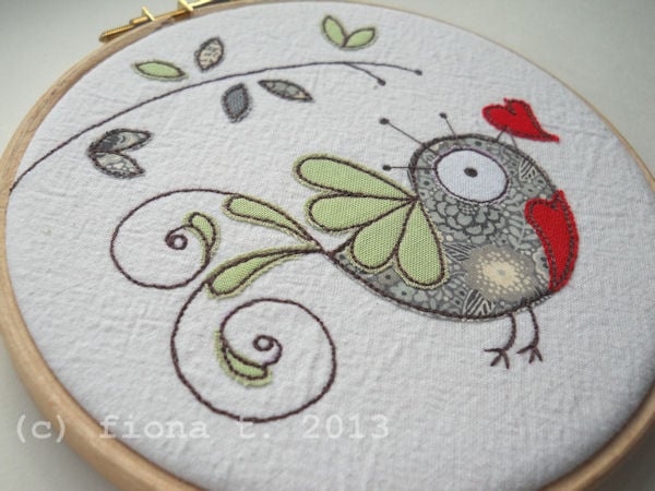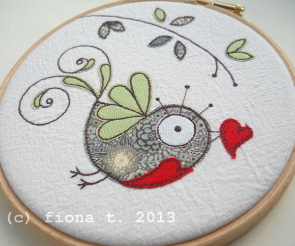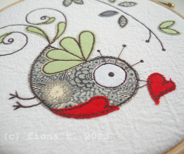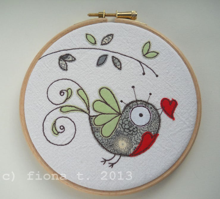 it features a little bird, carrying a red heart in its mouth. the bird is in a beautiful grey-green liberty print fabric, with a bright red heart on its chest. wing and tail feather detail is in apple green cotton, and the tiny leaves decorating the branch above its head are in coordinating cottons and linens.