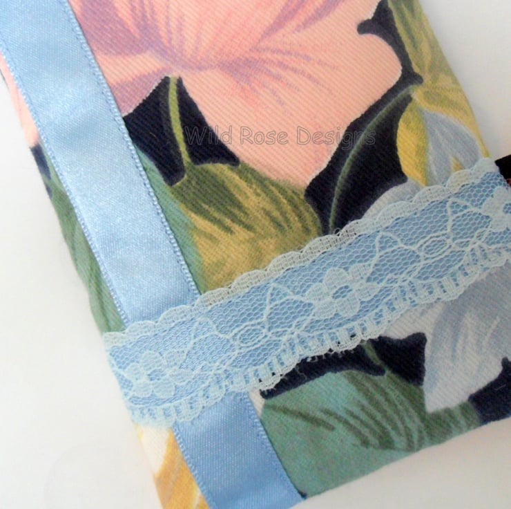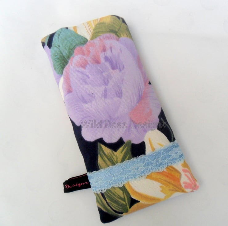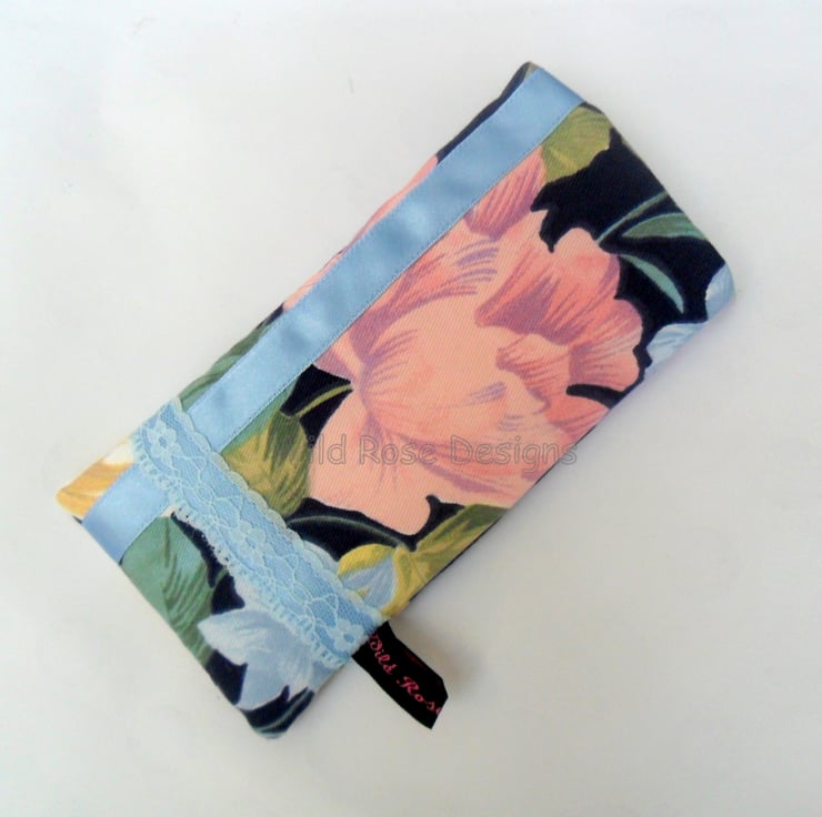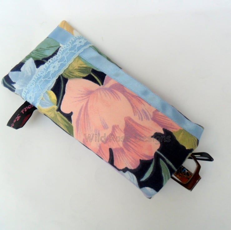 A pretty handmade glasses case made in a dark blue cotton floral print. It is trimmed with blue lace and ribbon and is lined in a cream cotton. The case is padded to protect your specs.
