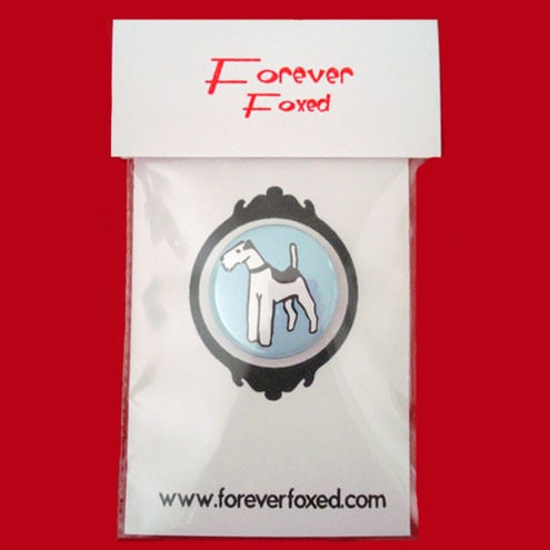 Cute Wire Fox Terrier on a lovely shiny badge with a metal pin back.