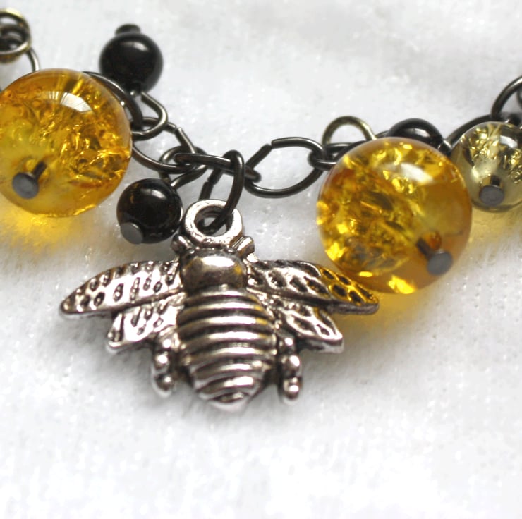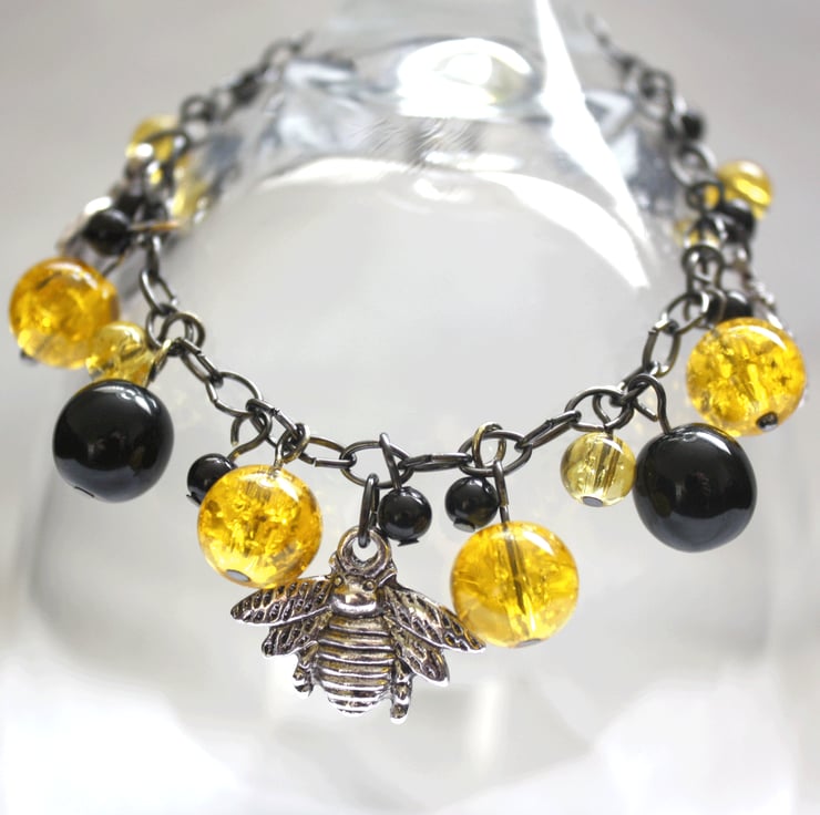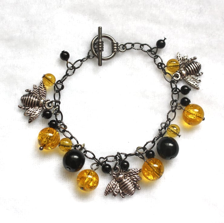 This unique bumble bee charm bracelet has been made using linked black antique oval jump rings and a black antique 13mm toggle fastener. Yellow crackled glass and black glass beads were added using black antique findings. The bracelet is finished off with 3 tibetan style metal bumble bee charms.