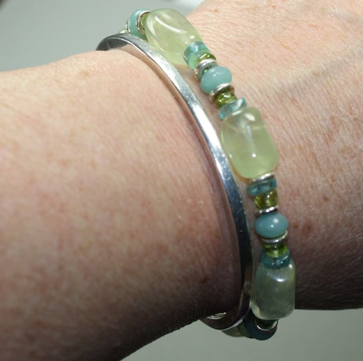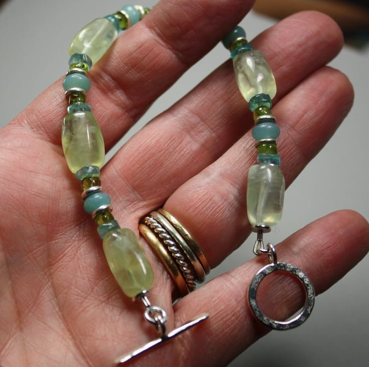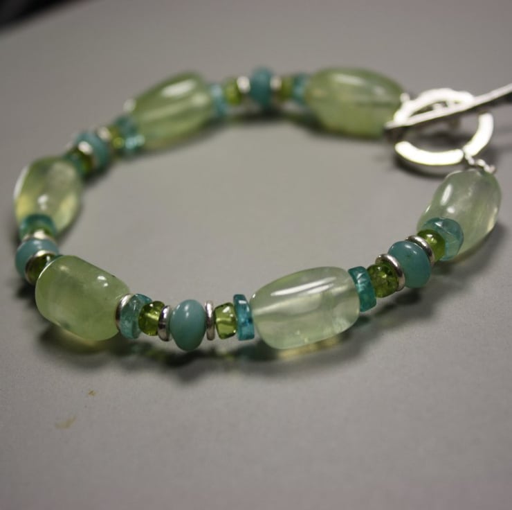 I have used large prehnite (green amethyst ) beads with smaller amazonite , apatite and peridot , interspersed with my silver washer beads. It closes with a silver toggle clasp.