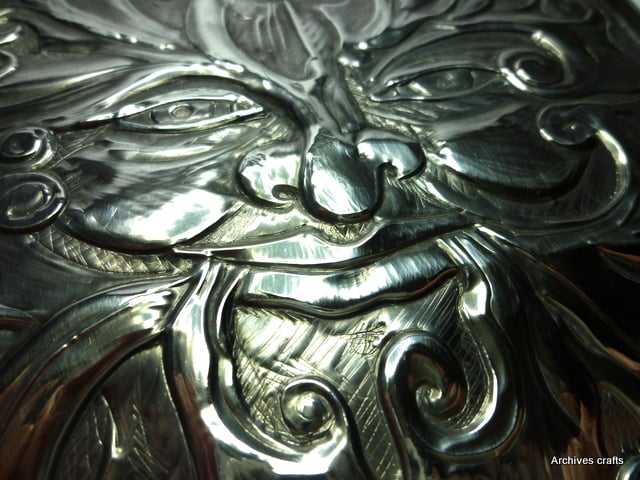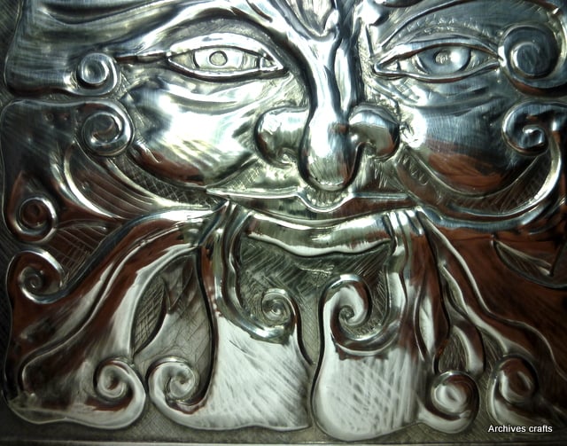 Green Man bas relief Picture / plaque hand tooled in pewter. This is an original art work, it is not cast hammered or stamped out but has taken hours of meticulous hand work.