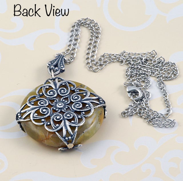 It is 35mm across (approx 1.25 inches) and I've moulded a decorative filigree wrap around the stone which has intricate detail on the back. The chain length is 45cm (18 inches).