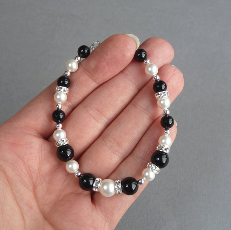 Jet Black and White Bracelet - Onyx, Pearl and Crystal Bridesmaids Jewellery