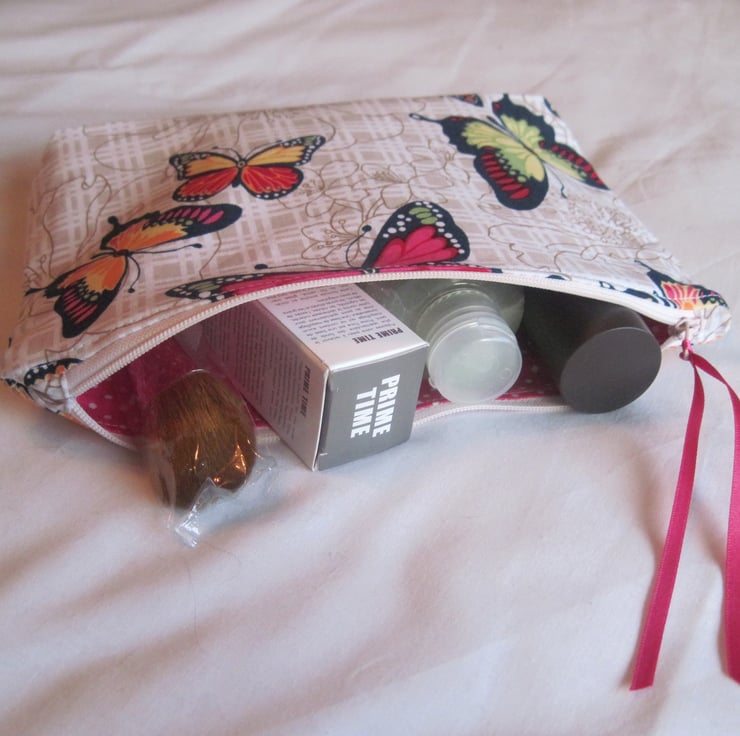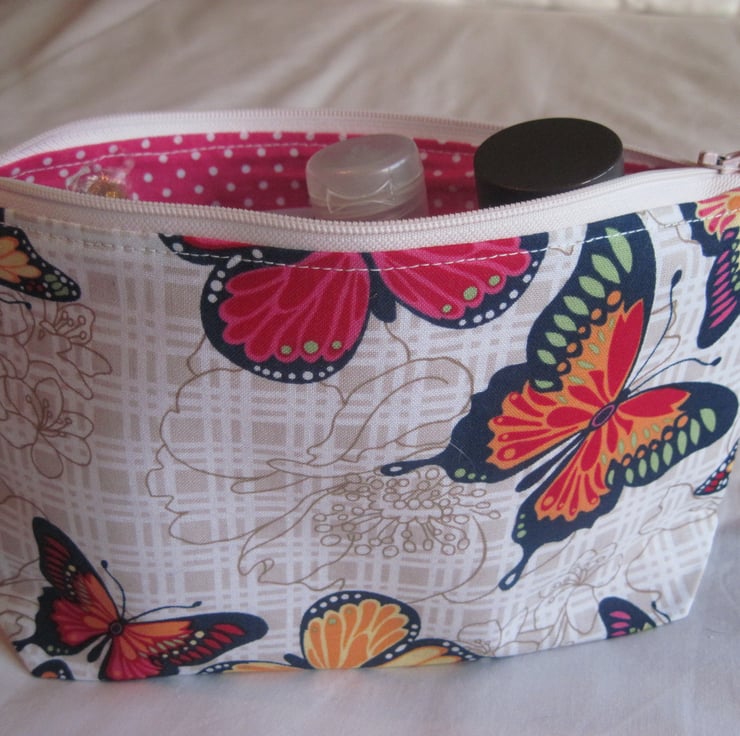 This lovely fabric case is made from a cotton outer fabric in various shades with an all over butterfly print . There is a white zip closure and the lining is made from a vibrant pink and white polka dot cotton fabric. The fabric used for the case has been interfaced to give it structure and a feel of softness.