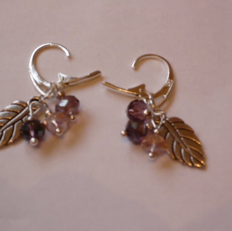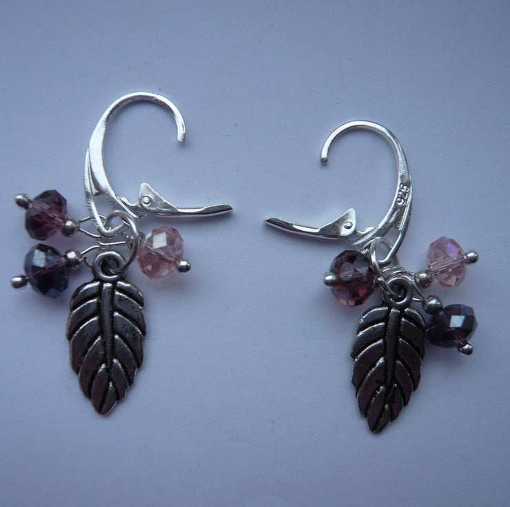 A tibetan style leaf charm and three glass rondelle beads make up these earrings. Pink and two different shades of purple rondelle 3mm beads are used. These hang from a sterling silver clasp ear hook.