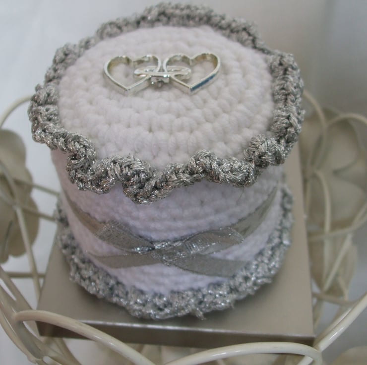 Crocheted in white, decorated in silver.