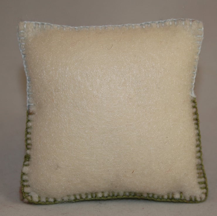 The back of the pincushion is cream kunin felt. The pincushion is gently stuffed with polyester filling.