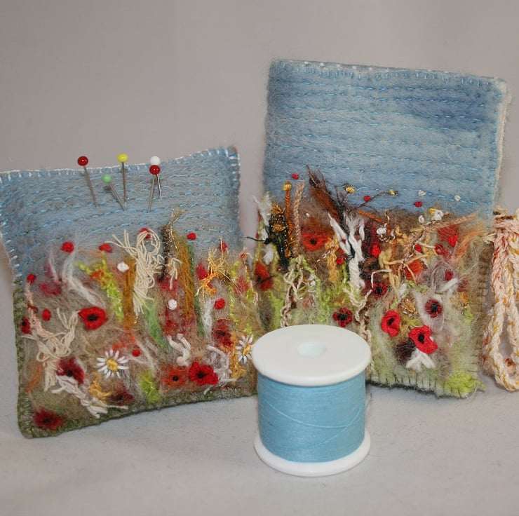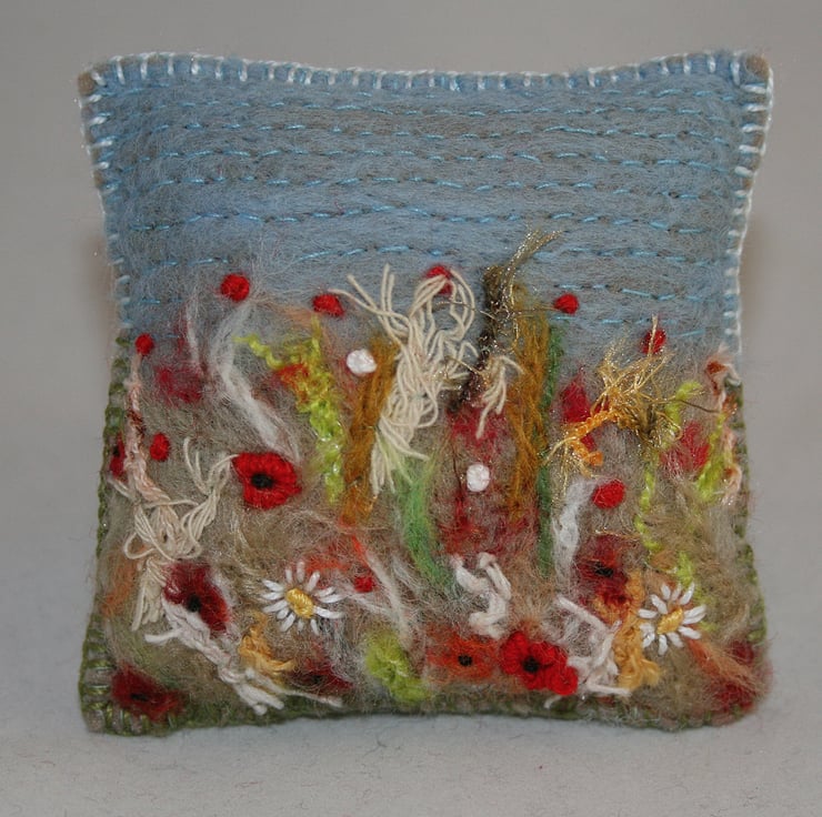A pretty, felted and embroidered cornfield with poppies decorates this pincushion.