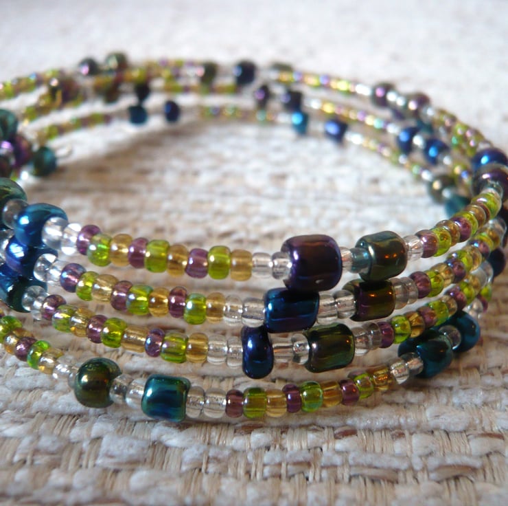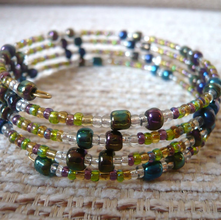 Lovely deep rich purple and green colours in the beads that make this bracelet. Four coils in total and since the photo was taken I have added some beads to hang from the end to add a bit of interest.