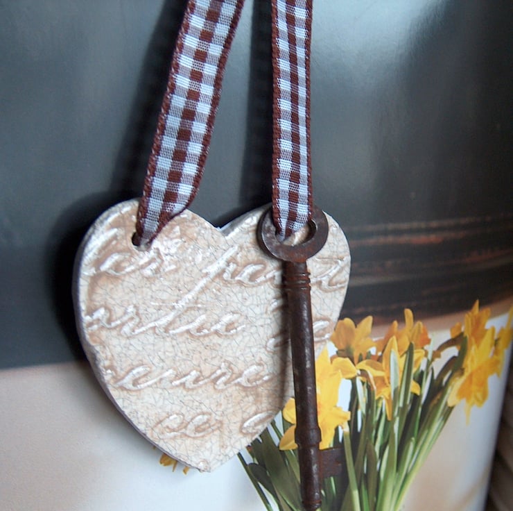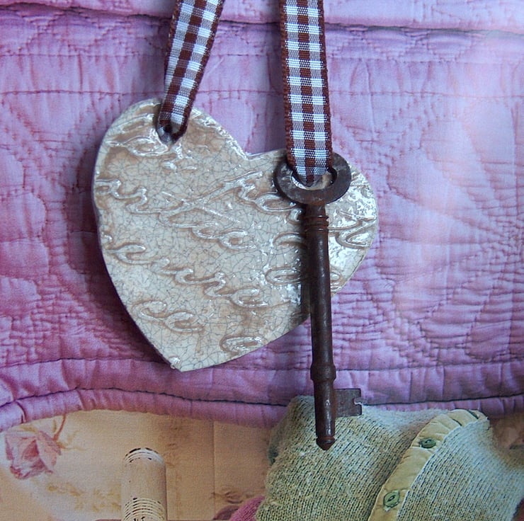 This is a handmade ceramic heart embossed with decorative text and coloured with a rustic light brown underglaze, and finished in a crackle glaze. It is attached to a lovely gingham ribbon, and has a vintage rusty key. Slovenly wedding favour, or gift for the couple who have everything?