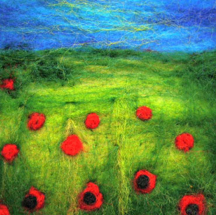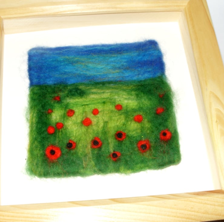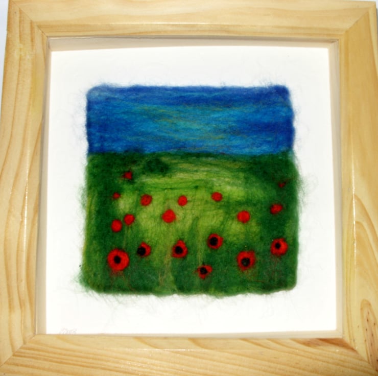 Needle felted poppy field picture, in deep pine frame. The method used to create these pictures means each piece is very unique. I have a real passion for poppies and you will notice the theme presenting itself in other items in my shop. We all associate the image of the poppy with remembrance day but I also read recently that it symbolizes imagination.