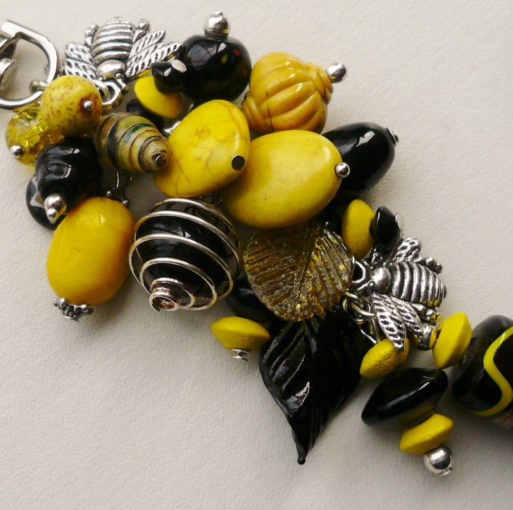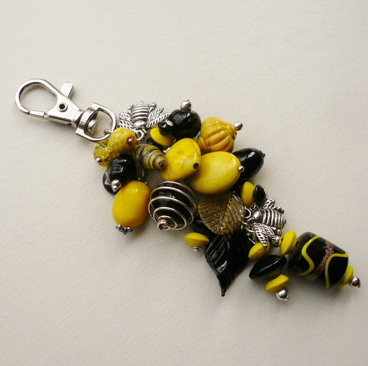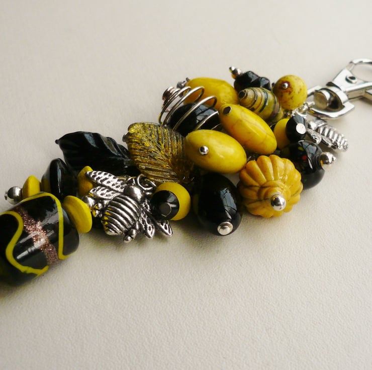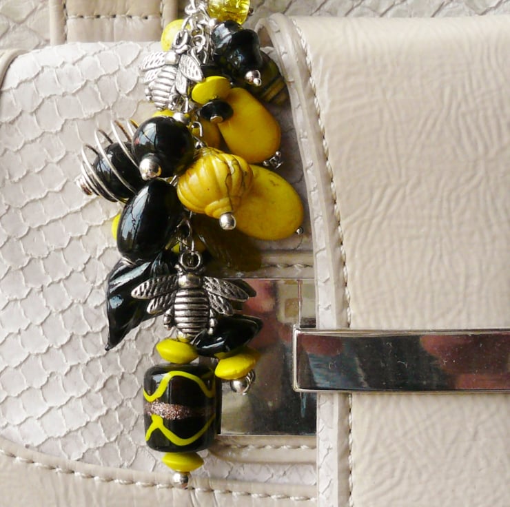 This large honey bee themed handbag charm consists of black and yellow glass, stone, wooden, ceramic and acrylic beads. Spacers, bead caps and chain are all silver plated as are the two honey bee charms. All attached to a silver plated 35mm trigger clasp. Total length incl clasp is 13cm.