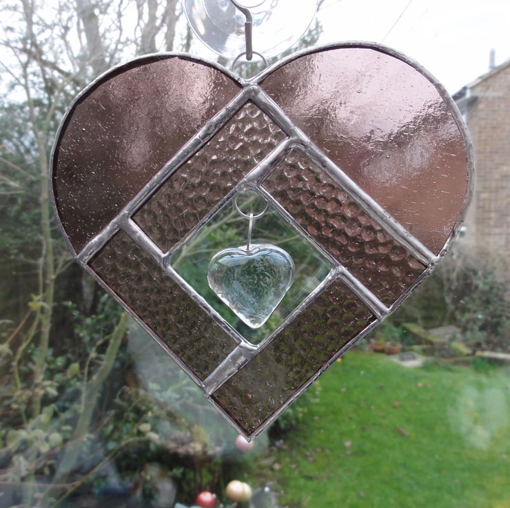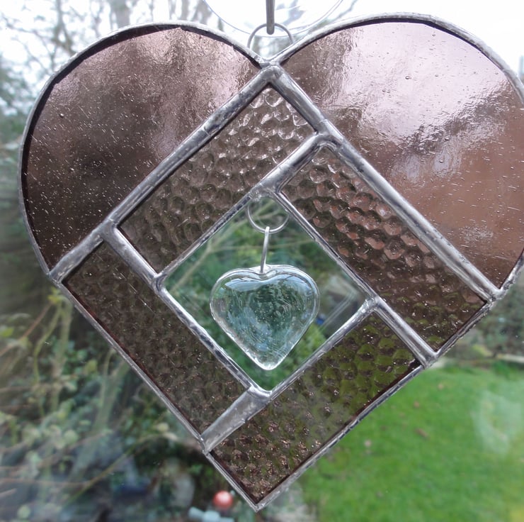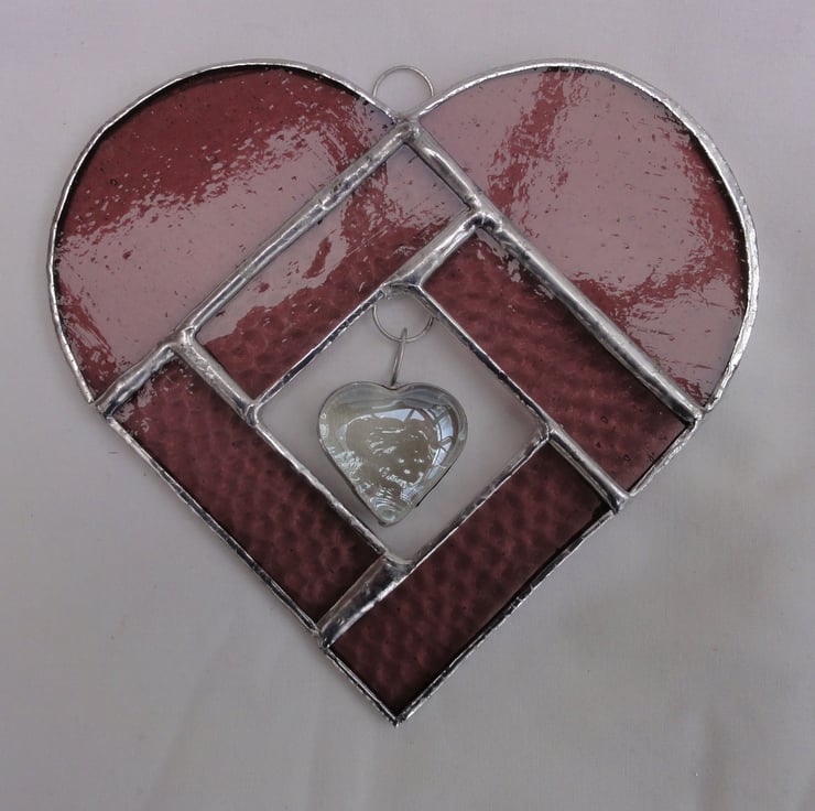 The glass used is pink restoration and pink hammered glass with a clear heart shaped nugget suspended in the middle. Each piece has been foiled and then soldered with a generous beading on the joints for added strength, I have left the solder silver. A ring has been attached for hanging purposes.
