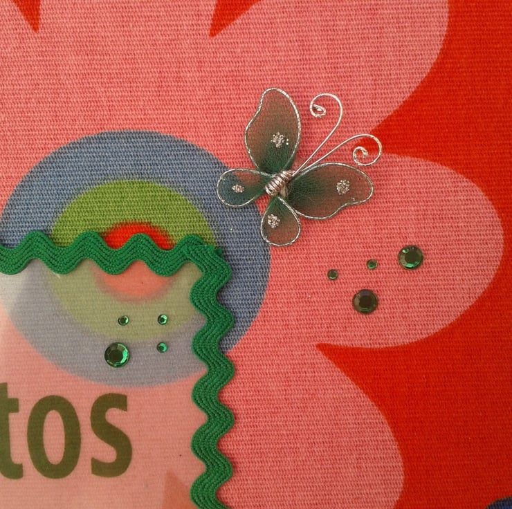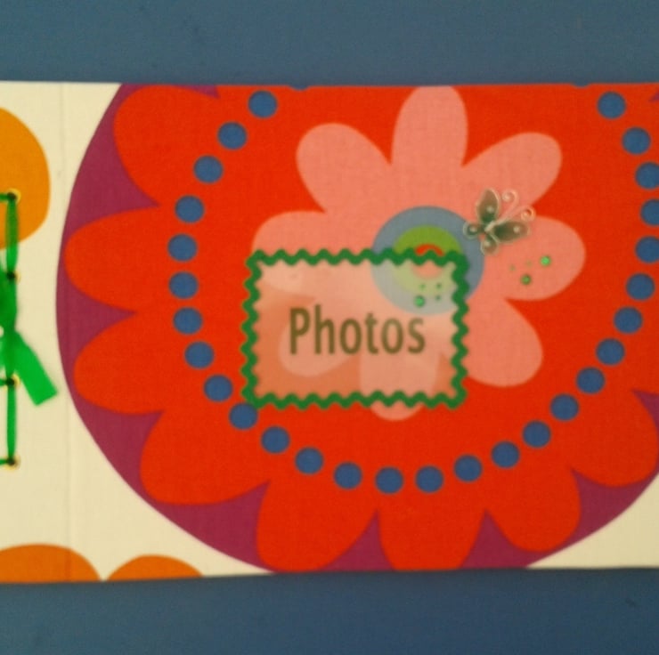 The front of the album has the word "Photos" and is embellished with coordinating green trim, a pretty organza butterfly and acrylic gems.