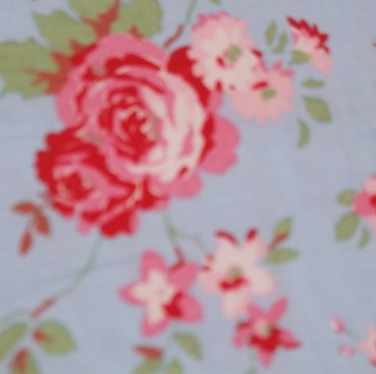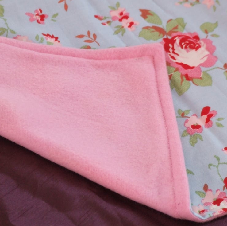 It is made in a soft furnishing fabric which is cotton. It is blue and has pink roses printed on it. The backing fabric is fleece in pink.