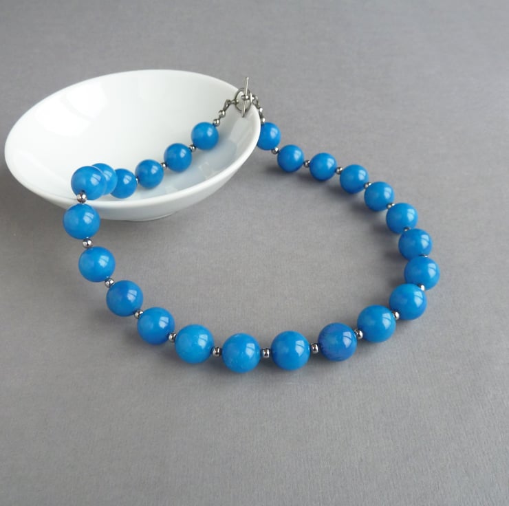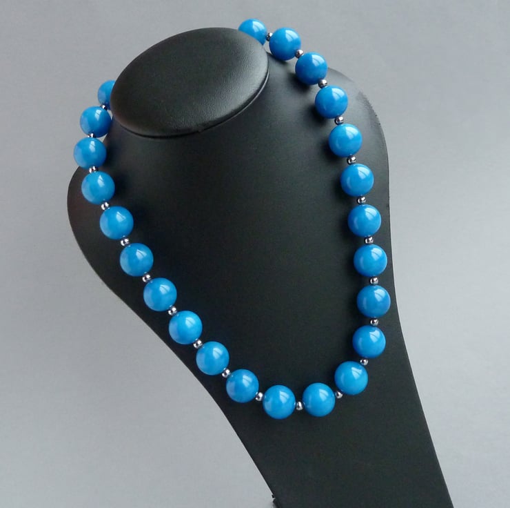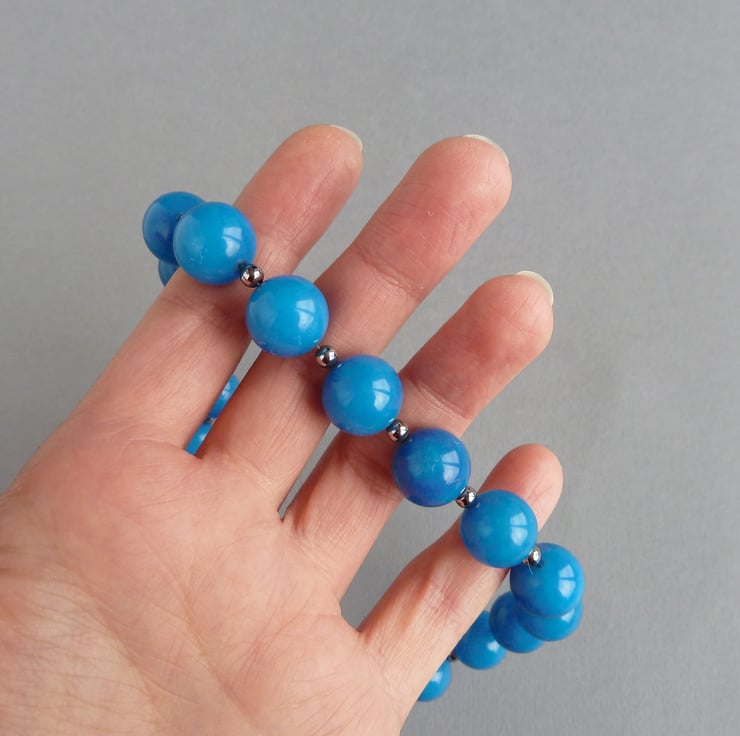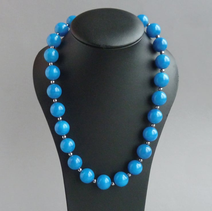 Each sea blue calcite bead is 14mm in diameter. These stones are spaced with round, black plated beads and finished with a toggle clasp. The length of this piece is 48cm (18.75inches).