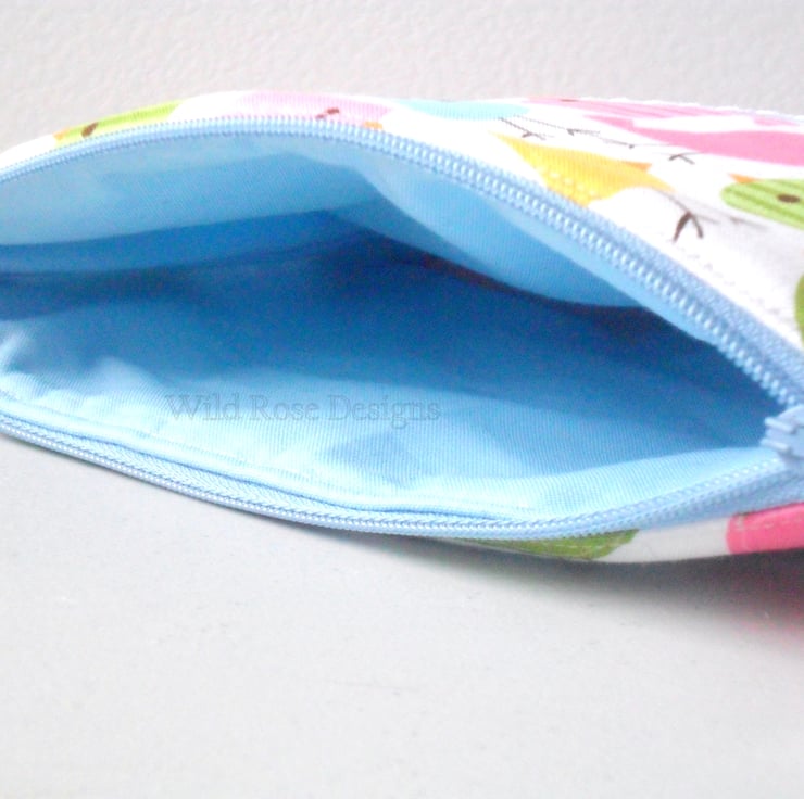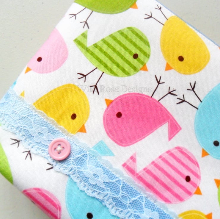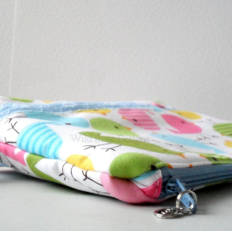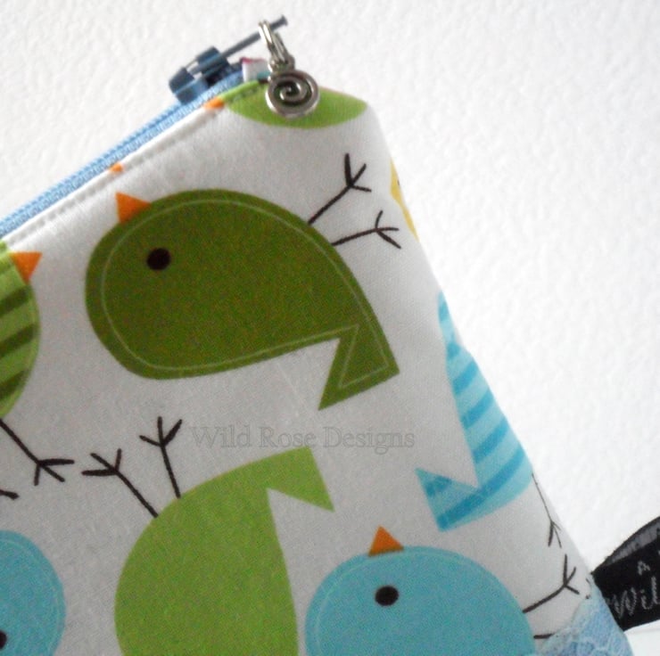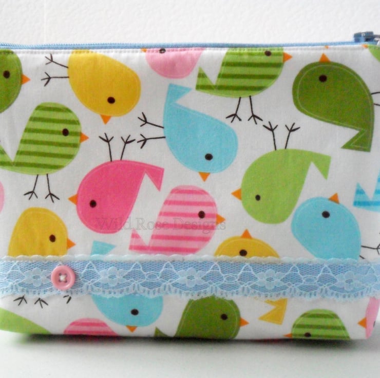 A bright and colourful handmade make up bag in a cute bird print fabric, could they be Easter chicks?