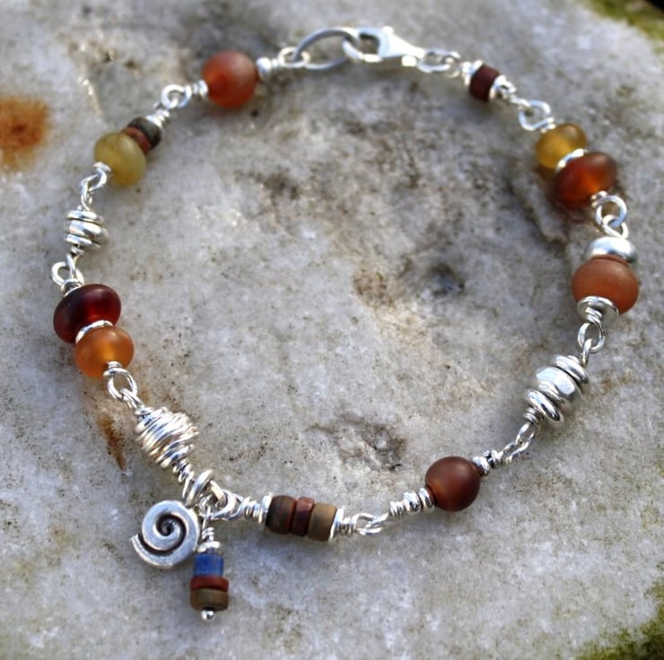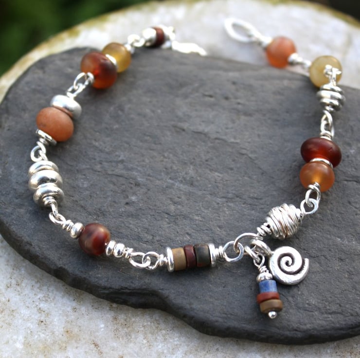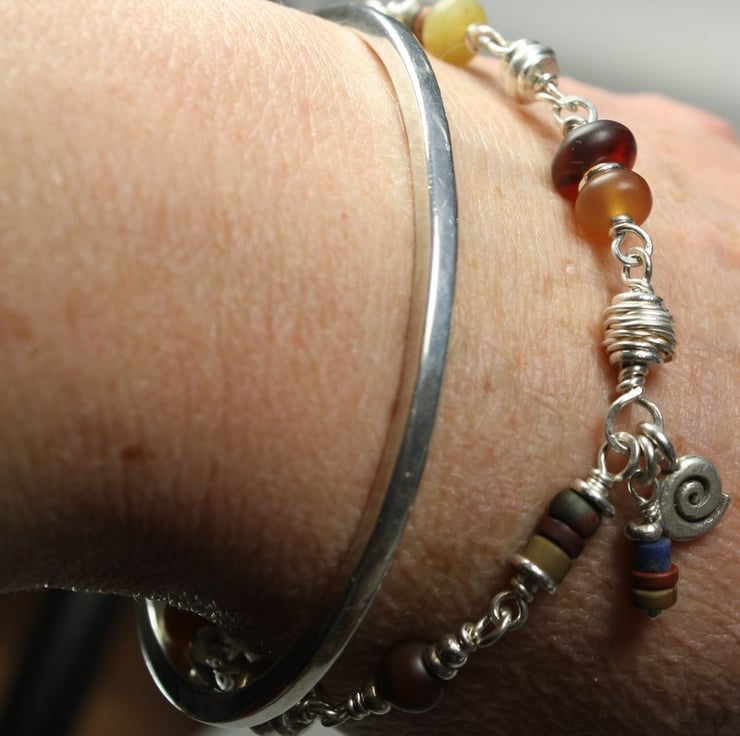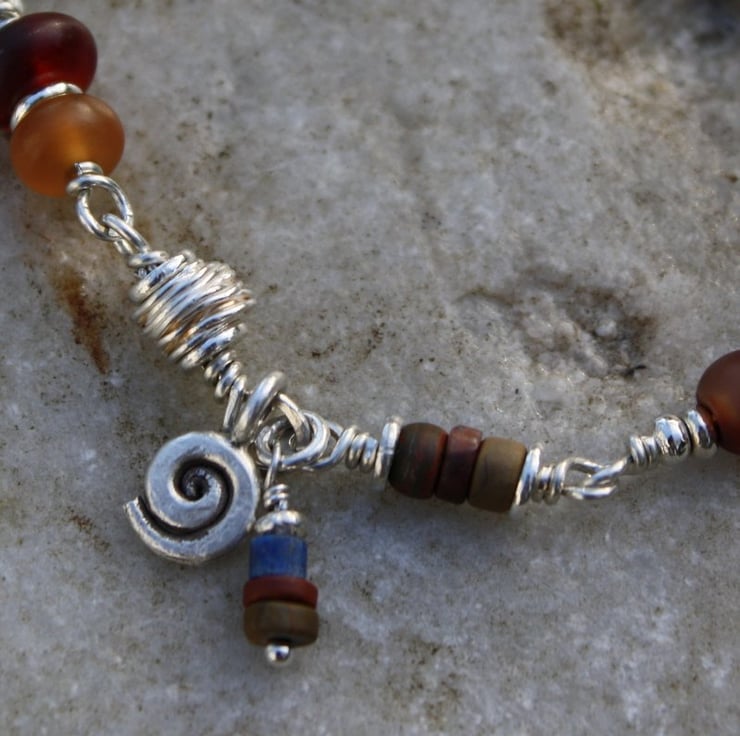 Each link is different, some incorporate silver beads, others carnelian , agate or jasper beads. I have added a little focal dangle comprising of a silver ammonite swirl and a jasper and lapis lazuli stack.
