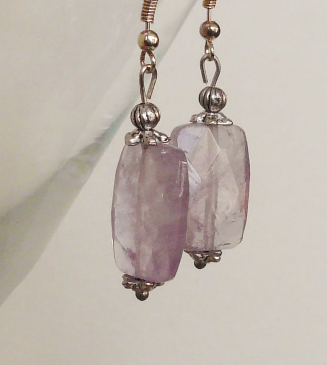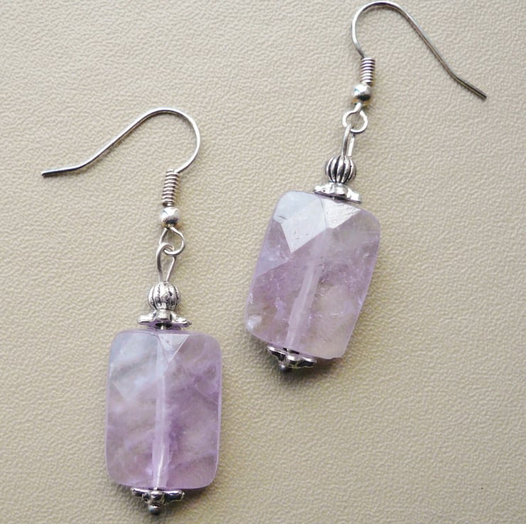 This pair of earrings is made up of 18mm long semi-precious Ametrine faceted rectangle beads with silver plated bead caps and spacers. Hung on silver plated ear hooks. Total length of earrings incl hook is 4.5cm.