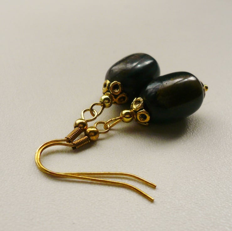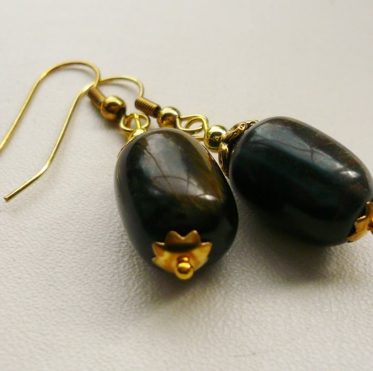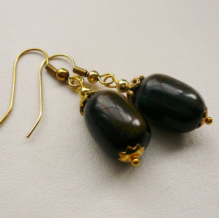 These earrings are made of 14mm long dark blue Tiger Eye barrel beads with gold plated bead caps and spacers. Hung on gold plated ear hooks. Total length of earrings incl hook is 4cm.
