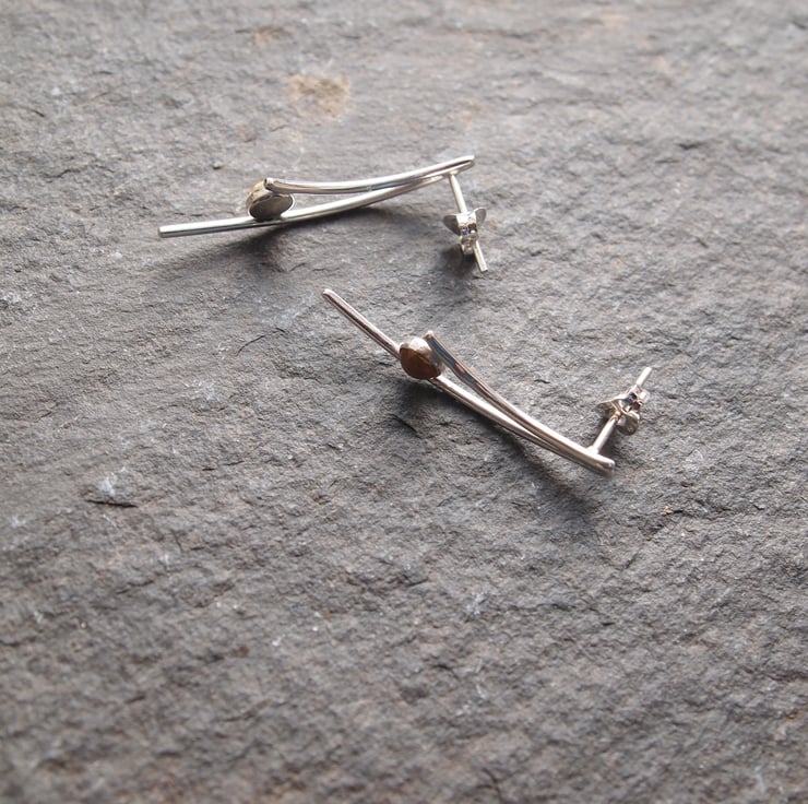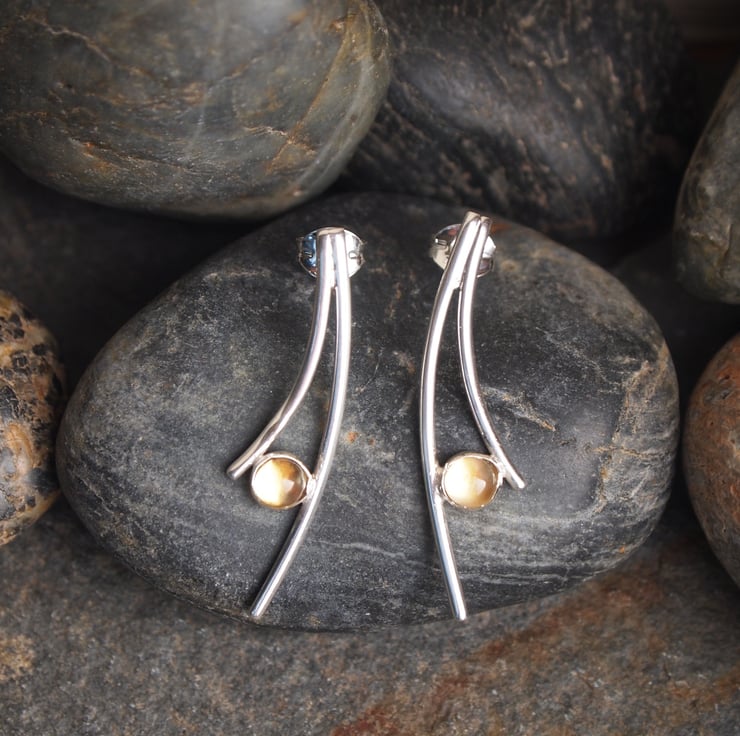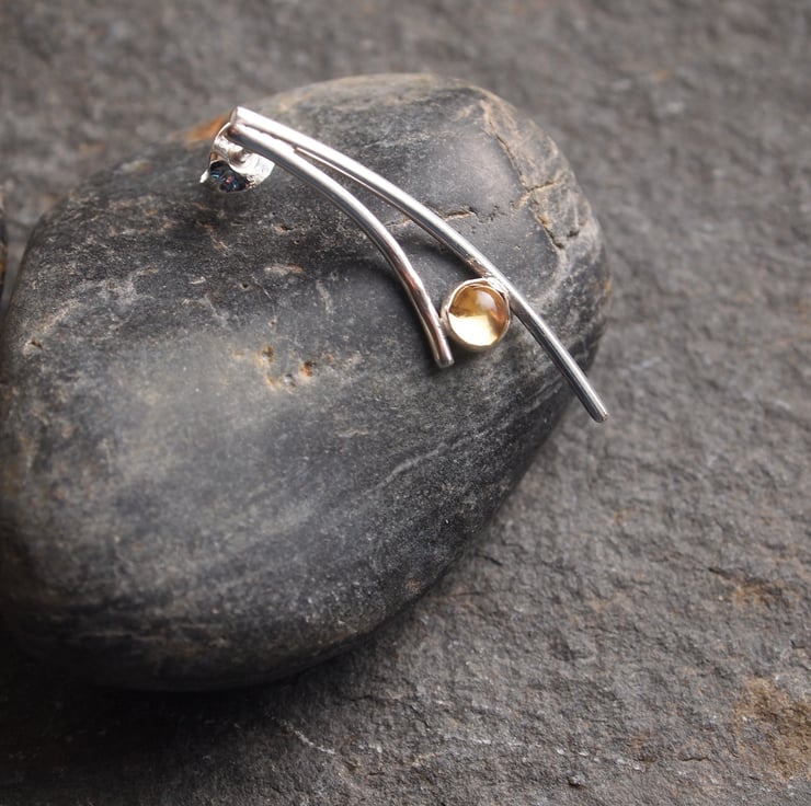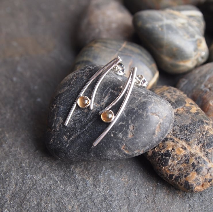 Two curved rods of sterling silver hold a citrine gemstone in each of these lovely handmade earrings.
