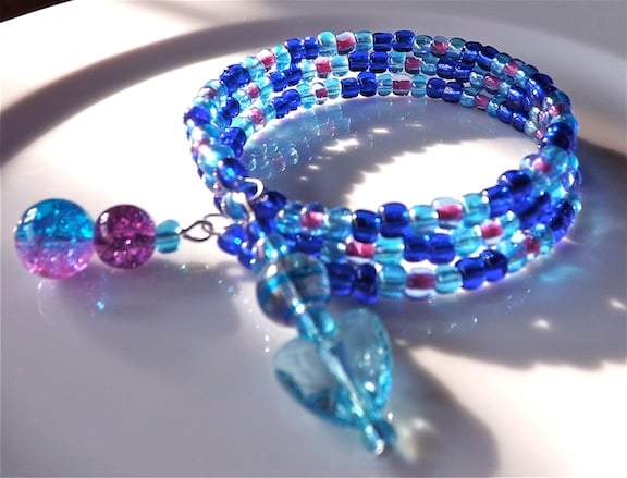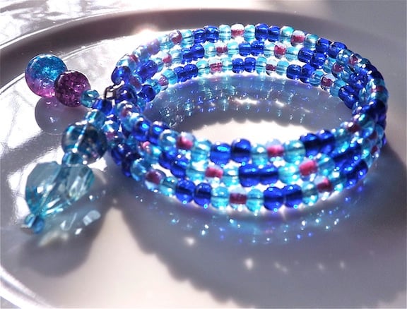 Inspired by earlier rainbow bead hooped earrings I have made ( see other listings ) the memory wire made me want to make patterns of rainbow beads in various harmonious colour ranges this is the blue mauve. Thank you for viewing, I will be adding to these rainbow spirals soon.
