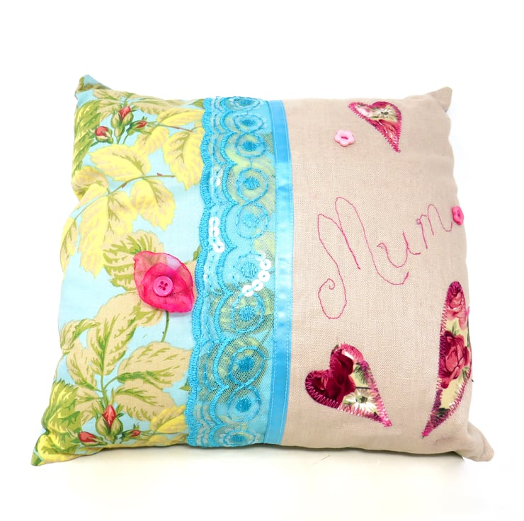 The front of this cushion, is made in two different fabrics. The right hand side is in a biscuit coloured Linen and has appliqued hearts in a pink cotton print, the word 'Mum' is machine stitched in deep pink and it has two pink flower shaped buttons. The left hand side is in an aqua cotton print with foliage and rose buds, and a small pink organza flower has been sewn to one of the stems. The edge of this panel is overlaid with sequined lace and matching narrow satin ribbon. The reverse of the cushion is a plain aqua coloured cotton with an envelope opening.