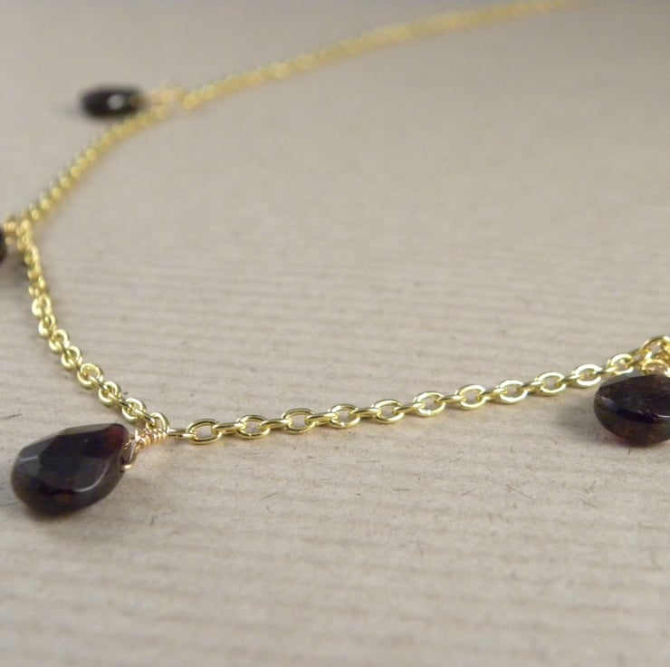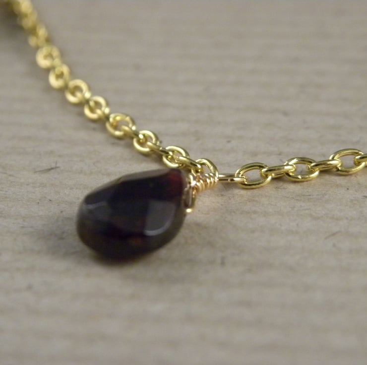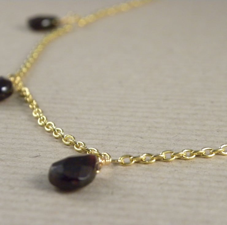 Deep dark red semi-precious faceted Garnet teardrops dangle from delicate Gold Plated trace chain to make this stunning necklace. The garnets are hand carved and measure 10 x 8 mm.